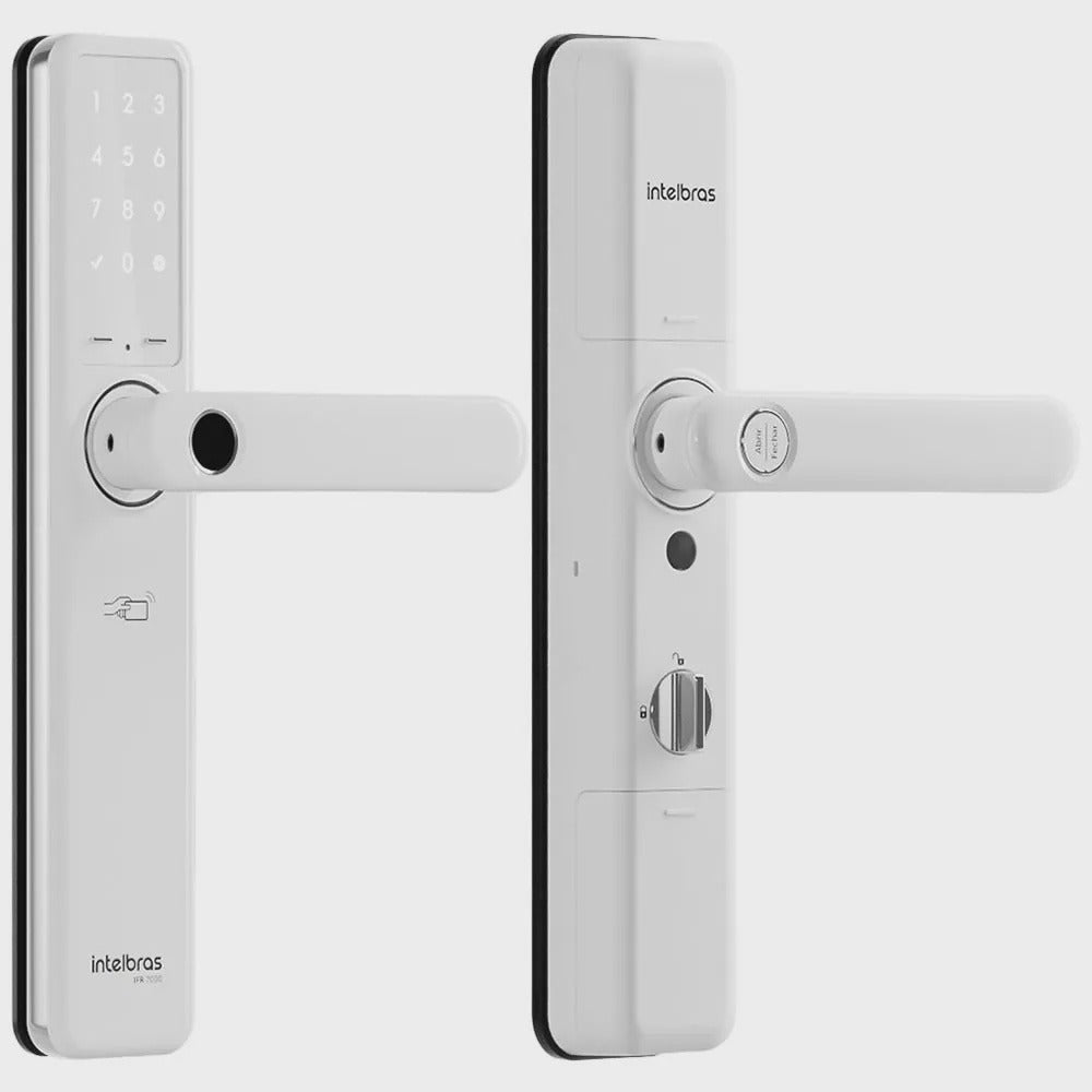 A ifr 7000, fechadura smart de embutir com maçaneta, permite até 100 biometrias, 100 tags, 9 senhas e acesso pelo app IZY¹. Acompanha 2 chaves físicas, 3 chaveiros de proximidade e 3 tags adesivas.