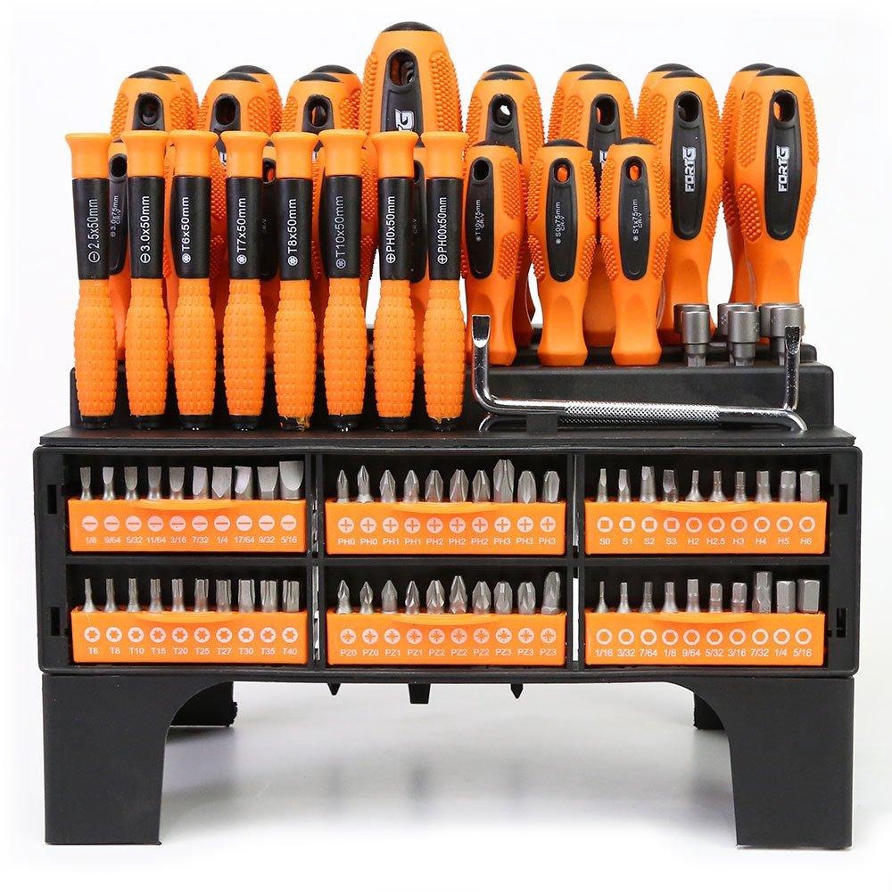 O Jogo com 100 peças de Chaves de Fenda e Phillips fortg pro FG8193 é composto por 23 chaves de fenda/phillips, 01 chave com catraca, 02 chaves offset, 08 chaves de precisão, 06 bits soquetes e 60 bits de 25mm. O jogo é produzido em aço cromo-vanádio, oferecendo durabilidade na utilização. Conta com acabamento cromado e temperado, ponta magnetizada e cabo ergonômico.