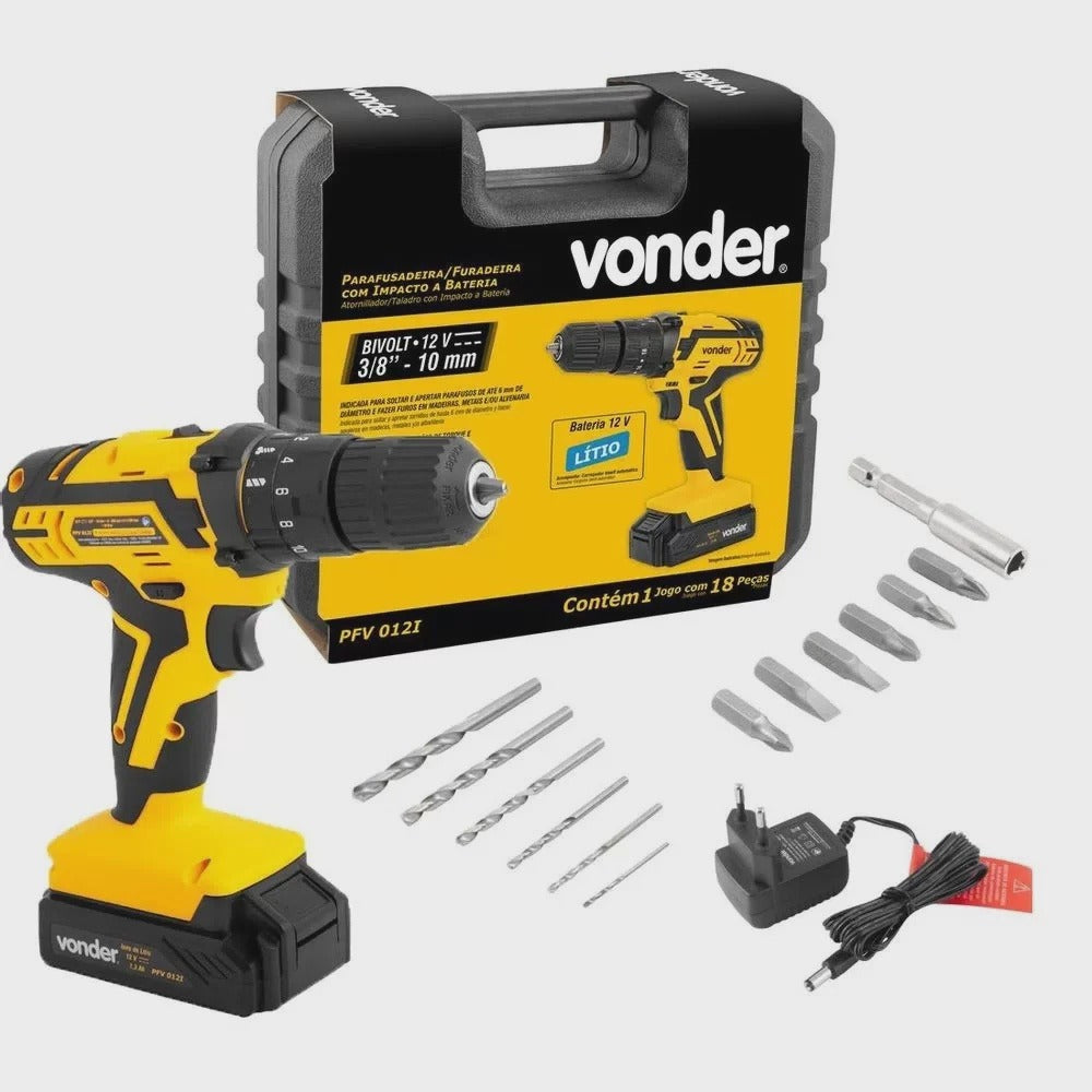 1 - Parafusadeira / Furadeira 1 - Maleta Plástica 1 - Bateria de 12V 1 - Fonte de alimentação bivolt automática 6 - Brocas hss (1,5mm, 2,5mm, 3mm, 4mm, 5mm e 6mm) 6 - BIts: 2 fenda (5mm e 6mm), 2 philips (ph1 e ph2) e 2 pozidrive (PZ1 e PZ2) 1- Soquete magnético encaixe de 1/4" - 6,35mm 1 - Trena de 5M Vonder