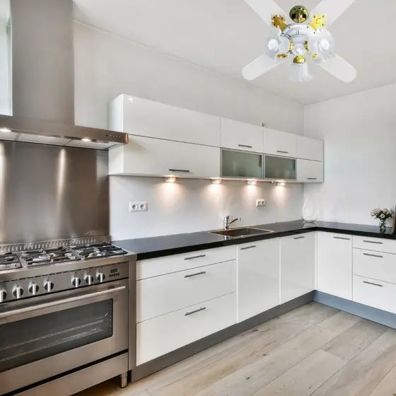 Pás: 4 pás de MDF Mogno ou Branco. Cor do Lustre: Branco/Latonado Cor da Estrutura: Branco/Latonado e Preto/Latonado